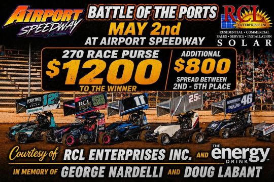 That's a Massive purse boost for the 270 class! This added payout is made possible courtesy of RCL Enterprises Inc In Memory Of: George Nardelli Doug Labant Co-Sponsor: The Energy Drink Reminder: The Battle of the Ports is a 2-day event! Starts Friday, May 1st Spirit Auto Center Speedway at Bridgeport Speedway Finishes Saturday, May 2nd at Airport Speedway Racer's