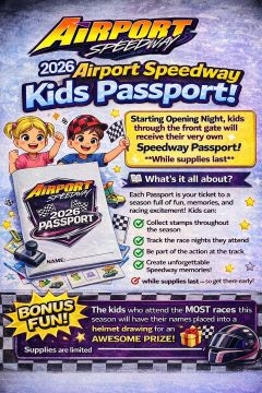2026 Airport Speedway Kids Passport Starting Opening Night, kids coming through the front gate will receive their very own Speedway Passport! While supplies last, so get there early! What's